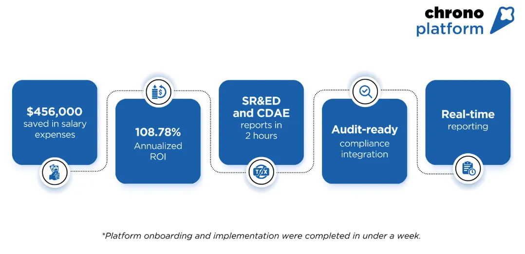 With this in mind, Chrono Platform strengthens the process by capturing real-time engineering data from tools like Jira, auto-classifying work with AI, and generating audit-ready narratives that anchor QREs to specific workstreams.